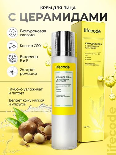 Крем для лица с церамидами и коэнзим Q10, 50 мл, lifecode, с мочевиной и витамином Е, увлажнение и восстановление - Разбор состава