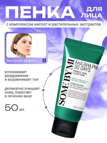 SOME BY MI Пенка для умывания лица корея с кислотами от прыщей AHA BHA PHA 30 DAYS MIRACLE ACNE CLEAR FOAM, 50 мл - Разбор состава
