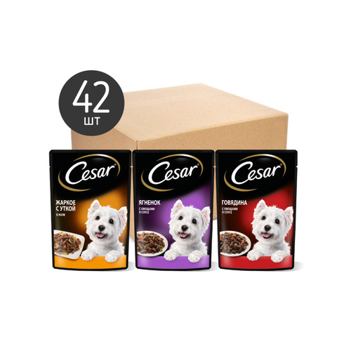 Влажный корм для собак Cesar набор три вкуса: желе 14 шт по 85 г + ломтики в соусе 28 шт по 85 г - Разбор состава